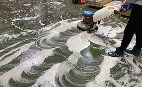 Tẩy sạch dầu mỡ: Sàn sơn epoxy thường xuyên tiếp xúc với dầu mỡ, chất lỏng gây trơn trượt. Máy móc chà sàn công nghiệp và hóa chất chuyên dụng sẽ bóc tách hoàn toàn các lớp dầu mỡ tích tụ này.